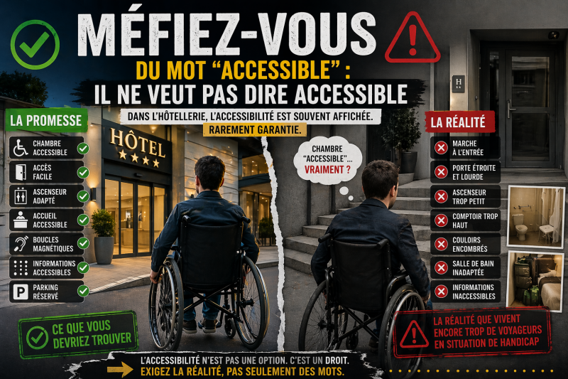Dans l’hôtellerie, le terme “accessible” est souvent considéré comme acquis, Et pourtant il existe très fréquemment une différence marquante entre ce qui est annoncé et la réalité. L'accessibilité est souvent utilisé comme un argument commercial censé rassurer les voyageurs en situation de handicap, et pourtant, derrière cette promesse en apparence simple, se cache une réalité bien plus incertaine, parfois approximative, souvent décevante.